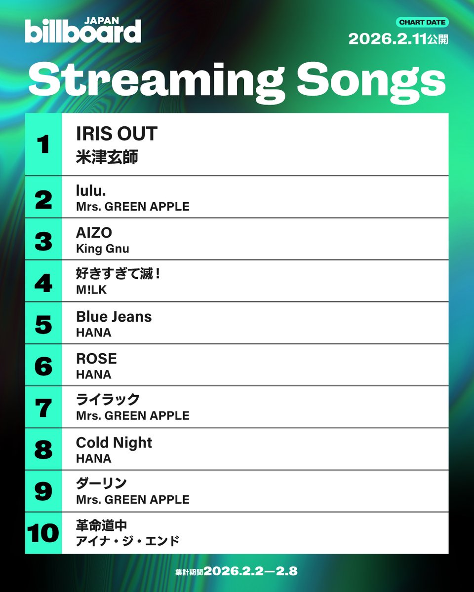 ニュース| 米津玄師の「IRIS OUT」(アイリス アウト)が、18日発表の最新「オリコン週間ストリーミングランキング」で1位を獲得。「連続1位獲得週数」記録を22週連続に伸ばし、YOASOBI「アイドル」と並ぶ、歴代3位タイ、ソロアーティスト歴代単独1位記録を自己更新した。 週間再生数は1117.2万回(11,171,569回)。2025年9月29日付から22週連続で週間再生数1000万...