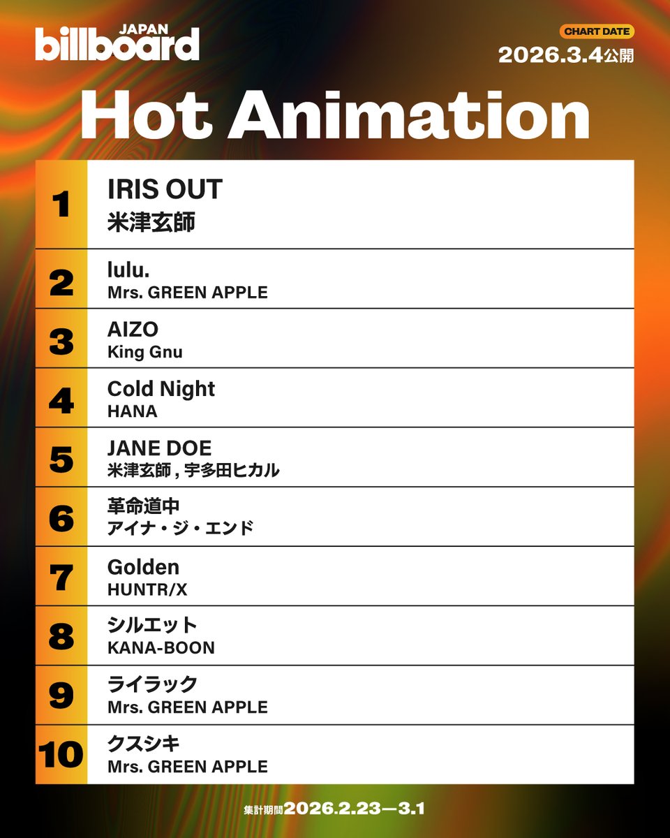 ニュース| 米津玄師の「IRIS OUT」が、25日発表の最新「オリコン週間ストリーミングランキング」で1位を獲得。「連続1位獲得週数」記録を23週連続に伸ばし、YOASOBI「アイドル」を超え、Creepy Nuts「Bling-Bang-Bang-Born」と並ぶ歴代2位タイに浮上、ソロアーティスト歴代単独1位記録を自己更新した。 週間再生数は1017.4万回(10,173,886回)。...