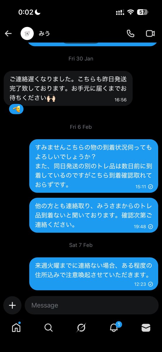 この方とやり取りできる方いらっしゃいますか? たまたまDMを開いたところブロックされておりました 1/30発送でまだ1週間経っていない、領収書もある中で特に気にしておりませんで…