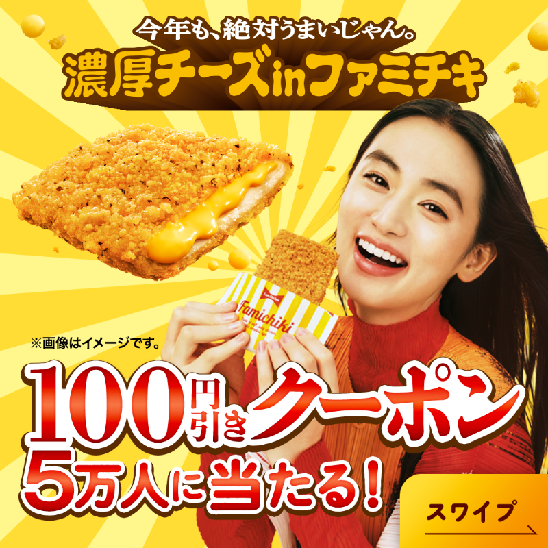 あと2日❗まだの人は急げ💨 毎日参加可能✨ 🧀濃厚チーズinファミチキ🧀 100円引きクーポン5万名にプレゼント💛 ①