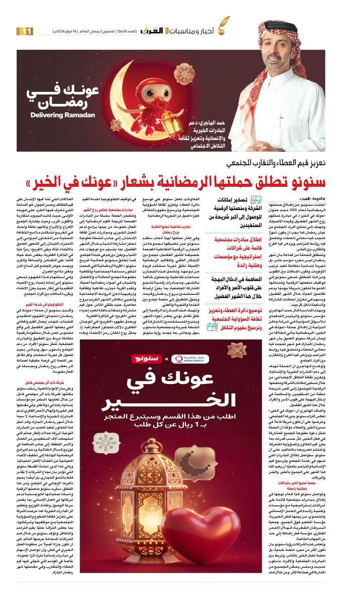 🔶🔸تعزيز قيم العطاء والتقارب المجتمعي.. سنونو تطلق حملتها الرمضانية بشعار «عونك في الخير»