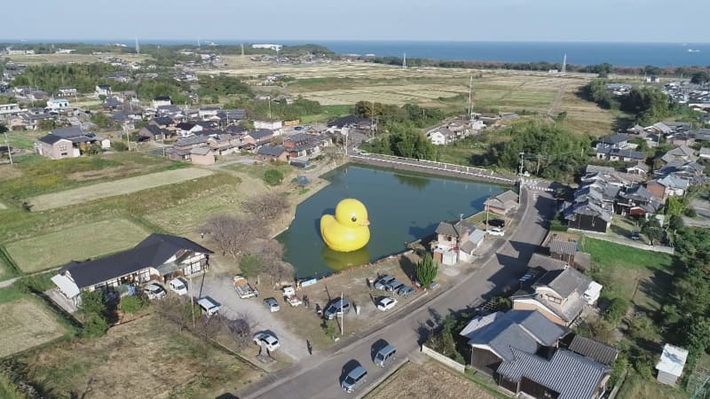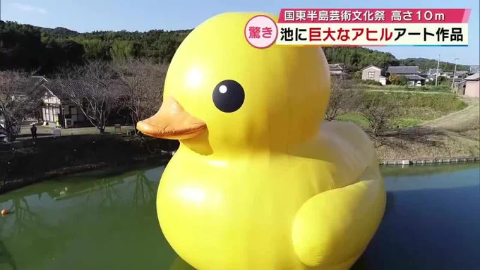 【でかい】九州初、大分のため池に巨大アヒル登場 夜はライトアップも