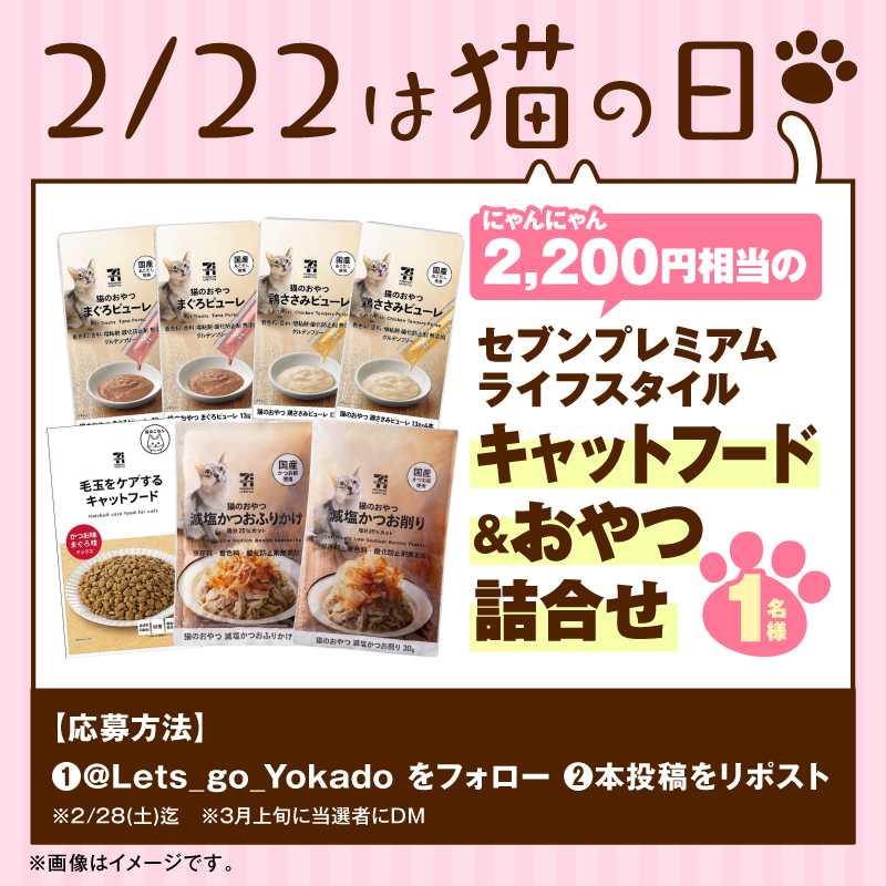 \\猫ちゃんにささやかなプレゼント🐈// 本日2/22は”猫の日”ということで… セブンプレミアムライフスタイル キャットフード&おやつ詰合せを 1️⃣名様にプレゼント🎁 【応募方法】 1️⃣