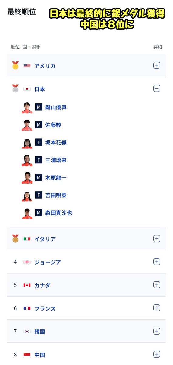 オリンピックに政治を持ち込みまくるも、中国はメダル圏外の8位で終了(日本は銀メダル獲得)