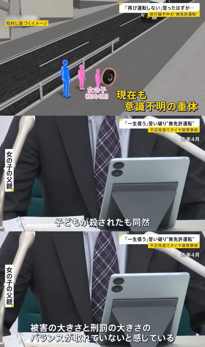 【ヤバすぎ】2023年に改造ジムニーの無免許運転でタイヤ脱落→幼稚園児を意識不明にした男、またもや無免許運転で逮捕 ■若本豊嗣(52)容疑者 ・2023年の無免運転で有罪判決 →裁判で「もう運転しない。一生かけて罪を償う」と述べるも、執行猶予期間にまた無免運転で逮捕 ・女児は現在も意識不明 ・「 無免許運転なのはわかっていたし悪いことだともわかっていたが、仕事をするために仕方なく運転した」と供述