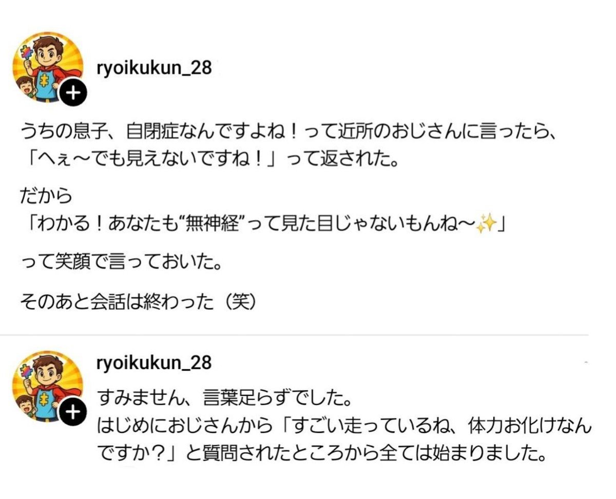自閉症の息子が近所を走り回る ↓ 近所のおじさん「すごい走ってるね!体力オバケですか?」 ↓ 父親「ウチの息子、自閉症なんですよね!」 ↓ 近所のおじさん「へ~。…でも見えないですね!」 ↓ 父親「わかる!貴方も“無神経”には見えなかったです😅w」 ↓ どう答えりゃ正解だったんだよと話題に
