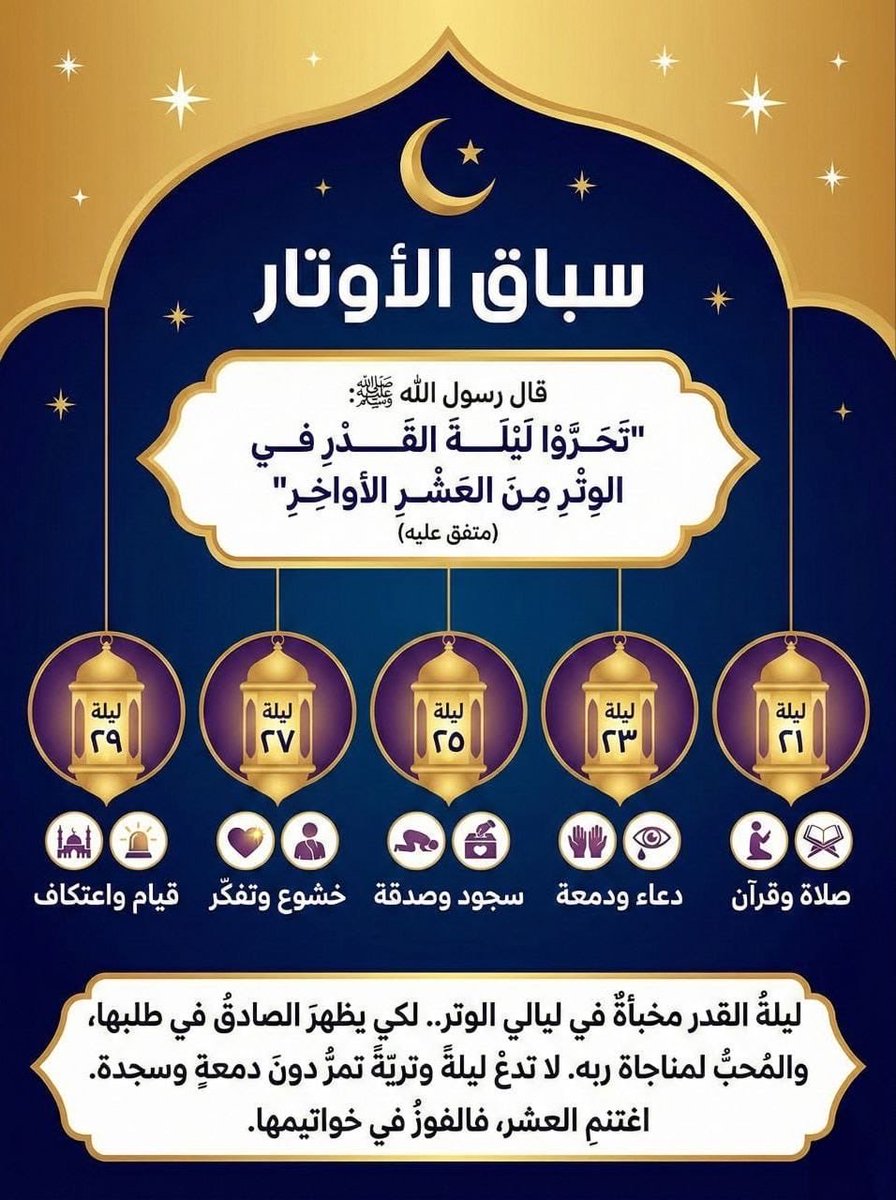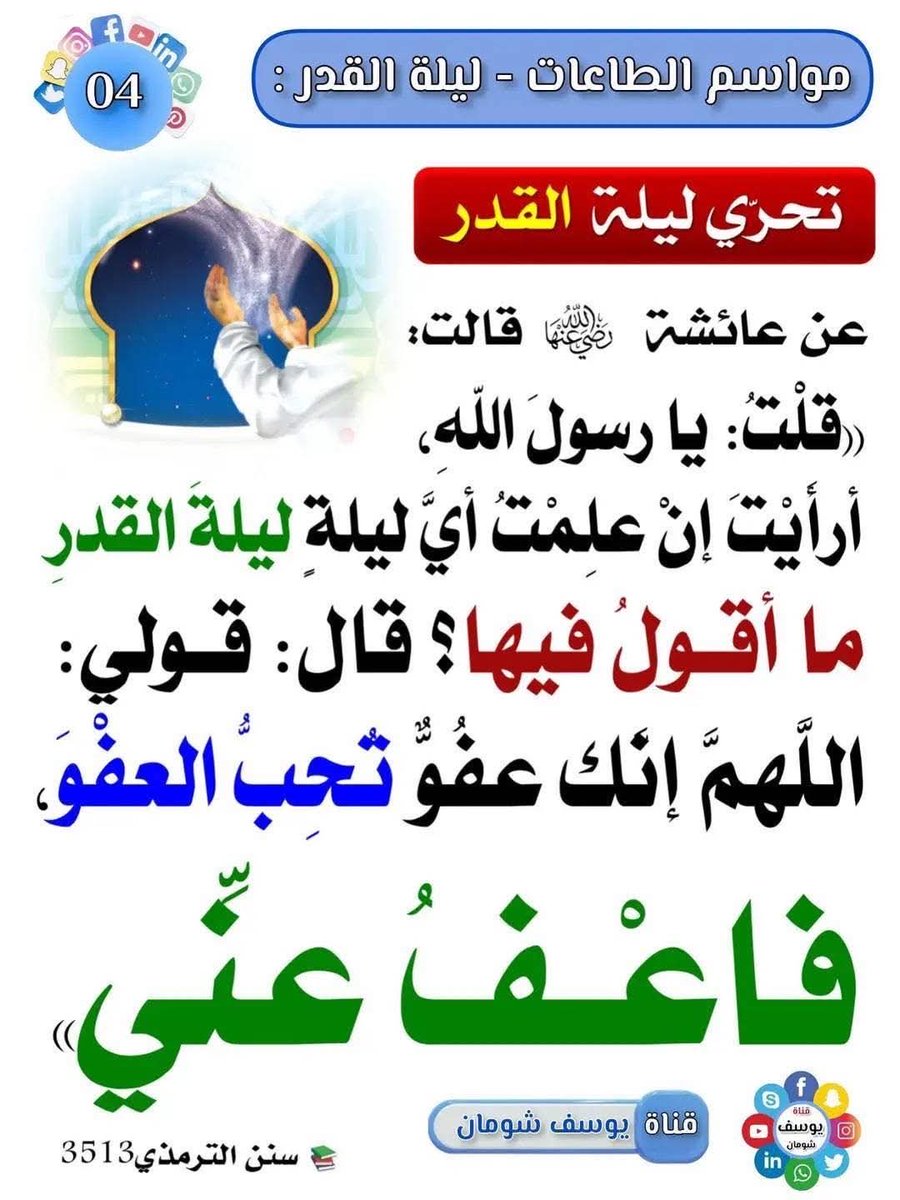 《 ليلَةُ القَدْرِ لَيْلَةٌ بَلْجَةٌ، لا حارَّةٌ ولا بارِدَةٌ، ولا يُرْمَى فيها بنَجْمٍ، ومِنْ علامةِ يومِها تَطلُعُ الشمْسُ لا شُعاعَ لَهَا 》.