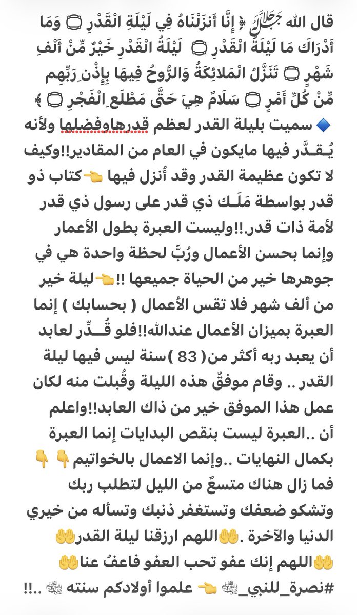 ( ليلة القدر ليلة سالمة لا يحدث فيها داء ولا يرسل فيها شيطان ، في ليلة القدر تنتشر الملائكة في الأرض فيبطل سلطان الشياطين 》