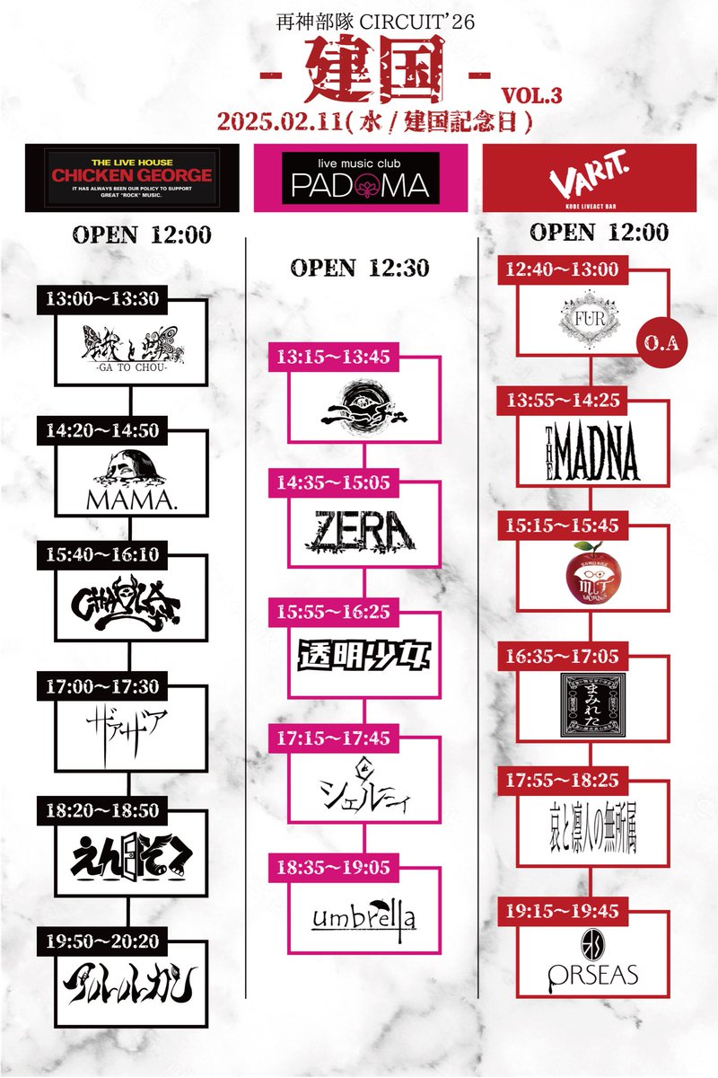 2026.02.11 神戸PADOMA 再神部隊CIRCUIT’26-建国-VOL.3 近年めきめきと熱を増している、神戸発のV系サーキットイベント「建国」! 神戸PADOMAのトリを務めさせていただきました。 関西バンドとして、神戸のV系シーンがさらに盛り上がっていくこと、 そしてその一端を担えるイベントに参加できたことを、とても嬉しく思います。 ご来場いただいた皆様、関係者の皆様、本当にありがとうございました! 次回ライヴは 2月15日 名古屋ハートランド ぜひお越しください! 本日のセットリスト