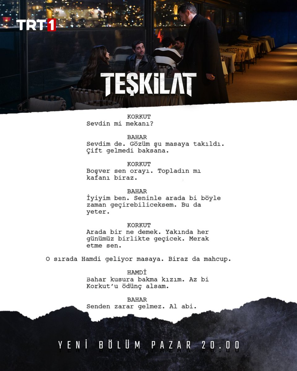 Şu replikli paylaşımı her hafta aynı kişileri vermekten vazgeçip ne zaman başrollere yapmayı düşünüyorsun .Hani aylar oldu ya size işinizi öğretmek yapılması gerekeni söylemekten o kadar sıkıldık ki usandıracak bir seviyeniz var.#TolgaSarıtaş#RabiaSoytürk#HilAl@teskilattrt