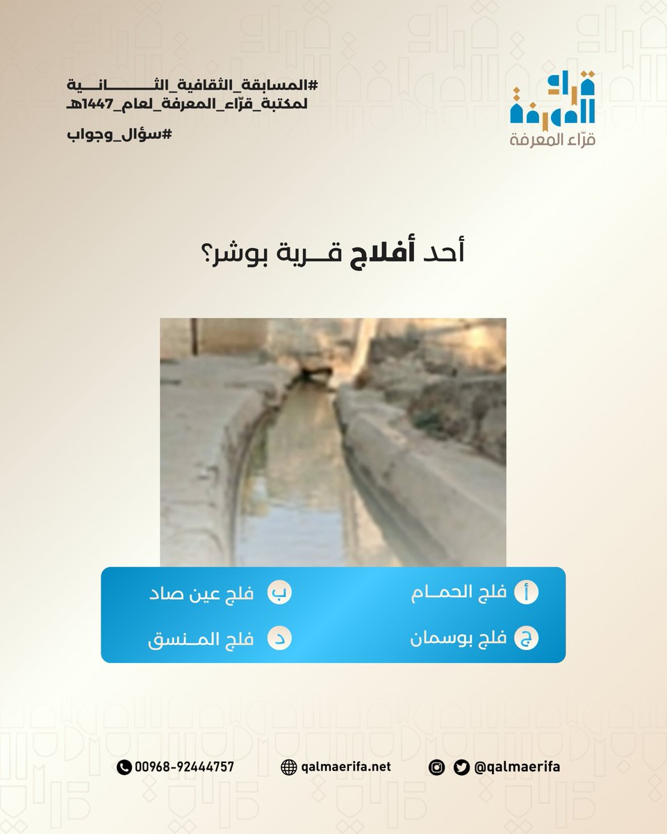 🌙 المسابقة الرمضانية الثقافية مع قرّاء المعرفة 🌙 سؤال اليوم الثاني: - أحد أفلاج قرية بوشر؟ أ. فلج الحمام ب. فلج عين صاد ج. فلج بوسمان د. فلج المنسق شاركونا إجاباتكم في التعليقات 👇 #المسابقة_الرمضانية_الثقافية #قراء_المعرفة #رمضان_1447 #ثقافة_عمانية #سؤال_اليوم
