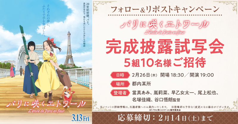 劇場アニメ『パリに咲くエトワール』キャスト&スタッフ登壇の完成披露試写会に 5組10名様をご招待!✨ 日時:2月26日(木)開場18:30 /開演19:00 会場:都内某所 応募方法 1⃣当アカウントをフォロー 2⃣この投稿をリポスト 📩当選通知はDMで 2/14(土)締切 詳しくは👇