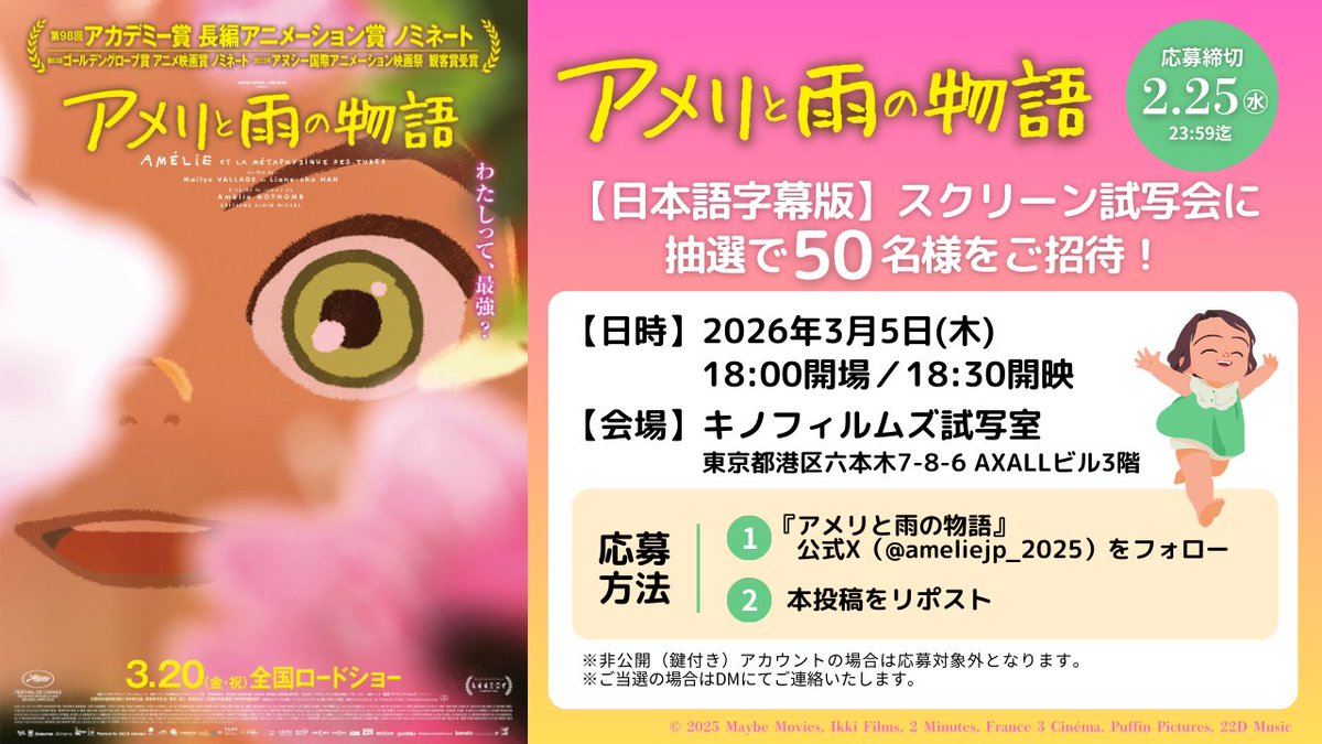 ⋱⋱試写会プレゼント🎁⋰⋰ 『アメリと雨の物語』 【日本語字幕版】 スクリーン試写会🎥 ✨抽選で50名様をご招待✨ ┈┈┈┈┈┈┈┈┈┈┈ 【日時】3/5(木) 18:00開場/18:30開映 予定 【会場】キノフィルムズ試写室 ┈┈┈┈┈┈┈┈┈┈┈ 【応募方法】 1️⃣本アカウントをフォロー 2️⃣この投稿をリポスト ※締切▶️2/25(水))23:59 ※当選の方にはDMにてご連絡✉ ご応募お待ちしています❗ 3.20 FRI🎬